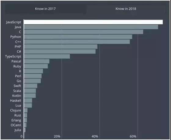 调查显示,2018年的所有开发语言中,JavaScript是最受欢迎的语言。2017年最受欢迎Java则被超越,位居第二。