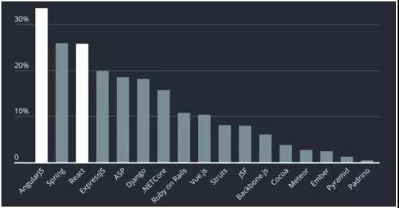 2018年,最闻名的开发框架是AngularJS、其次是Spring。