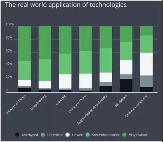 最近几年,新技术层出不穷,如IoT(物联网)、深度学习、机器学习、计算机视觉、区块链、量子计算、AR(增强现实)、VR(虚拟现实)等。这些新技术,到底哪个在开发者心目中是最接近现实,目前看来最容易落地的呢。经过调查,IoT以53%占比获得第一名、量子计算排名最后,区块链倒数第二。