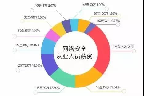 2018年9月18日,中国网络安全人才培养分论坛发布的《2018网络安全人才发展白皮书》数据显示,信息安全从业人员薪资遥遥领先,其中,薪资水平在30万以上的占据20.6%,75.18%的安全从业人员薪资在10-30万之间,远高于同类IT人才。同年,麦可思研究院发布了《2018年中国大学生就业报告》,在“本科毕业生半年后月收入排名前10位的专业”信息中,信息安全类专业排名第一。在一线城市,安全(渗透)工程师的平均月薪资达14820元。