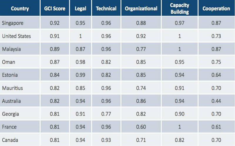 网络安全投入度方面位列前十的国家还包括:马来西亚、阿曼、爱沙尼亚、毛里求斯、澳大利亚、格鲁吉亚、法国、加拿大和俄罗斯(格鲁吉亚和法国并列第8)。