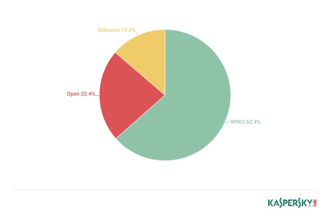 约四分之三的接入点使用基于Wi-Fi保护接入(WPA/WPA2)协议家族的加密技术,这被认为是最安全的接入点。保护级别主要取决于设置,例如热点所有者设置的密码强度,复杂的加密密钥可能需要数年时间才能被成功破解。
