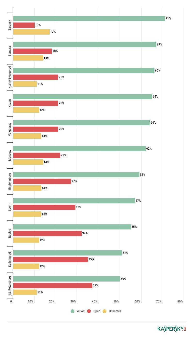 不安全连接的比例最高的三大城市是圣彼得堡(48%的Wi-Fi接入点是不安全的)、加里宁格勒(47%)和罗斯托夫(44%)。