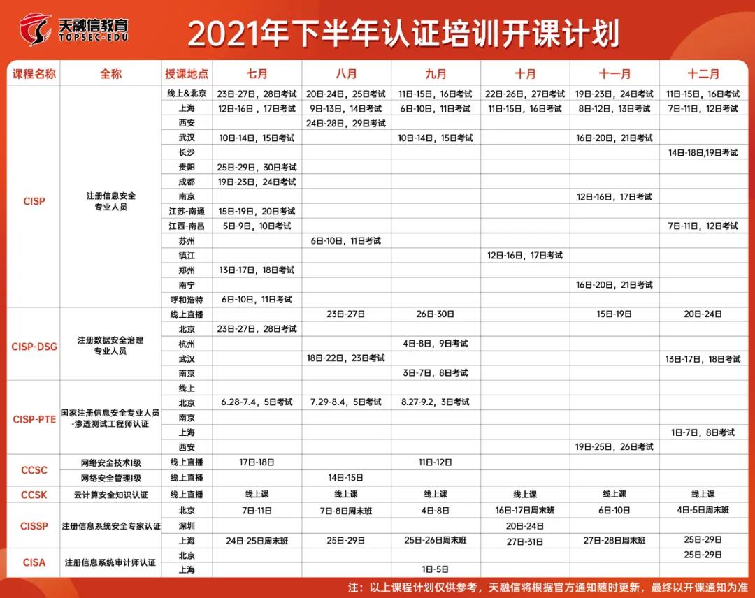 天融信2021年下半年的开课计划已发布,课程详情查看下图~