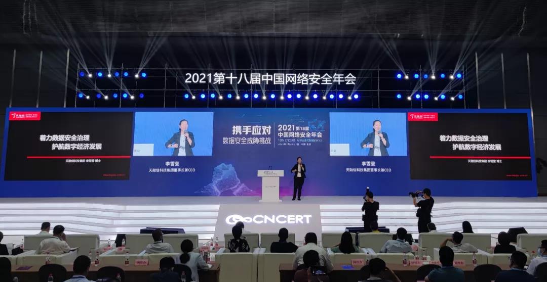 7月20日,由国家互联网应急中心主办的“2021中国网络安全年会”在北京国际会议中心拉开帷幕。本次年会以“携手应对数据安全威胁挑战”为主题,聚焦国内外网络安全工作新情况、新形势与新挑战,汇集党政机关有关部门领导、知名院士、专家学者、知名网络安全机构和企业负责人等嘉宾,共话数据安全未来发展趋势,共谋数据安全深入合作。天融信科技集团董事长兼CEO李雪莹博士应邀出席主论坛,并以《着力数据安全治理 护航数字经济发展》为题发表精彩演讲。