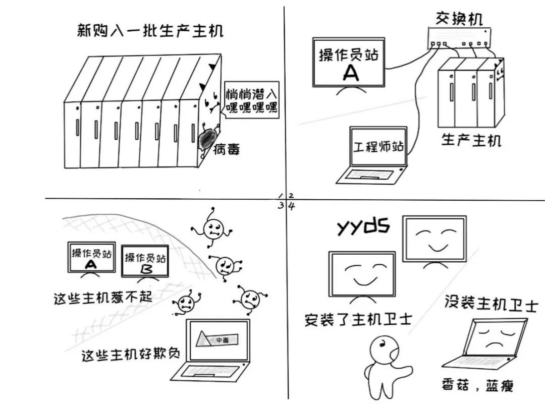 解决措施:在工业控制系统的主机上部署工控主机卫士,主机卫士有别于反病毒软件不依赖急剧增长的特征库,根据工业生产的具体生产环境建立可信白名单,对系统资源占用量小,亦适用于工控环境中老旧设备,是一款真正适用于工业场景的防护软件。