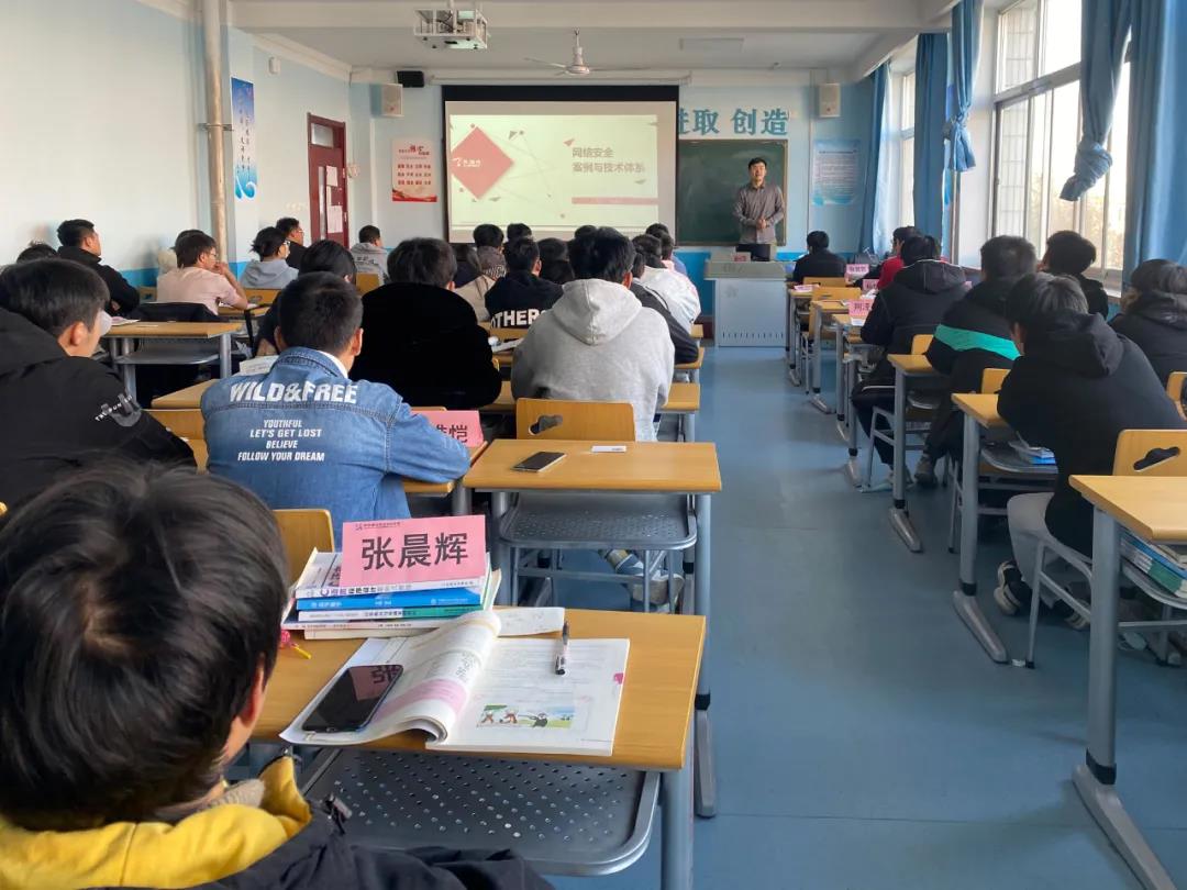 接下来,天融信教育凌老师为学生进行了网络安全行业及订单班课程体系等相关内容的介绍和分享。凌老师通过对网络安全行业人才供求现状、行业薪资及发展前景等方面的介绍与分析,让同学们进一步认识到行业优势所在,从而更加坚定了学习网络安全的决心;又结合自身经验及企业要求,对订单班课程体系做了解读,为同学们今后的学习指明了方向。