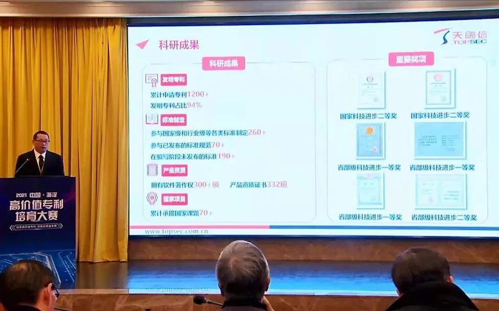 12月24日,国内首个以高价值专利为主题的全国性创新大赛-2021中国•海淀高价值专利培育大赛(简称:海高赛)决赛在北京隆重举行。天融信参赛项目《自带安全特性的超融合系统》凭借精湛的技术能力和全面的专利布局荣获2021年海高赛三等奖。天融信科技集团高级副总裁毕学尧作为项目牵头人全程参与决赛并出席颁奖典礼。