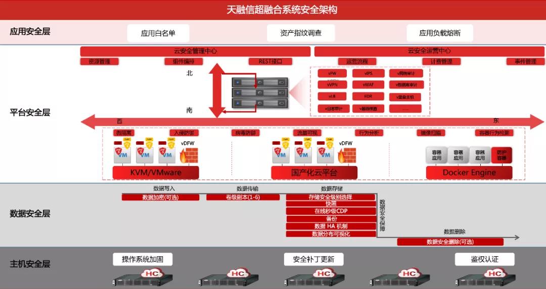 天融信超融合系统是一款一体化交付,在主机层、数据层、平台层和应用层提供全面安全特性的云计算平台: