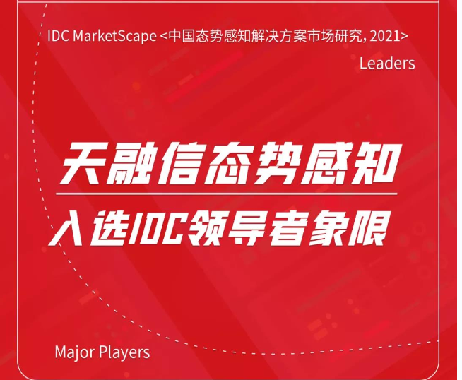 11月22日,国际权威咨询机构IDC正式发布《IDC MarketScape:中国态势感知解决方案市场2021,厂商评估》报告,天融信态势感知入选领导者象限!