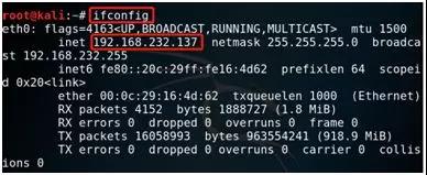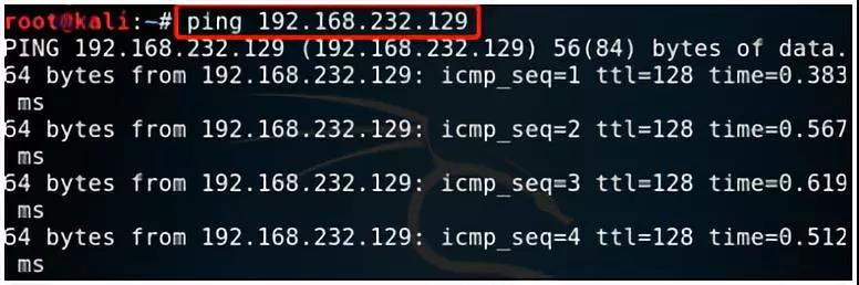 在Kali Linux下执行连通信测试:ping 192.168.232.129
