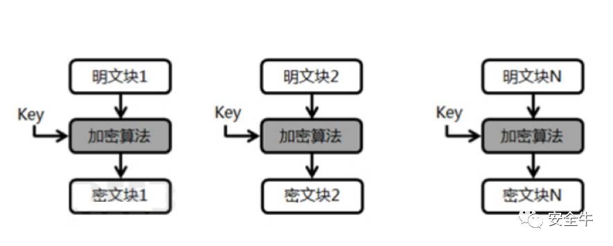 ECB模式加密效率高,但安全性低,模式如下图: