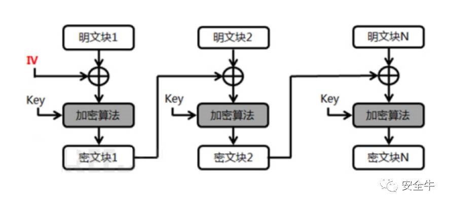 CBC加密效率虽然没有ECB高,但安全性则高得多。模式如下图: