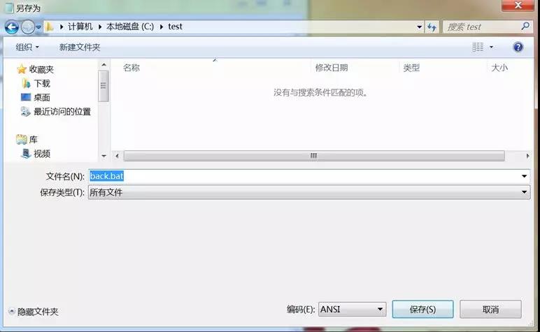 2.写完后保存为back.bat,就存在C盘test目录(自己建一个)下。这里强调一下,保存类型一定要选择“所有文件”,如下图所示。