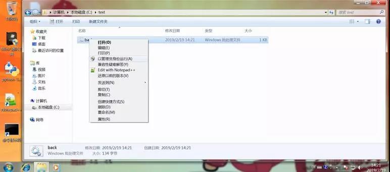 3.接下来,打开“我的电脑”,进入C盘刚建的test目录,鼠标右击刚才创建的back文件,选择以管理员身份运行,操作系统会弹出如下对话框,直接选是。