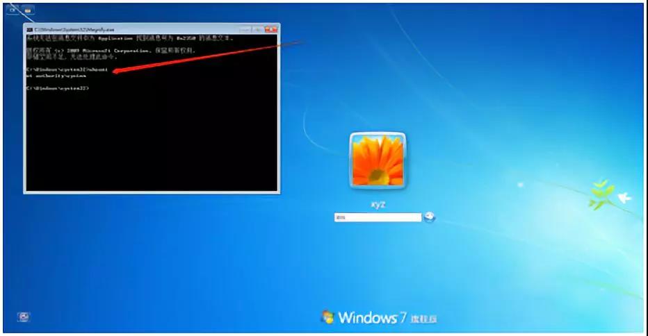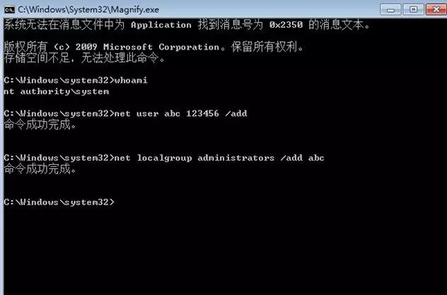 4.你没有看错,系统在没有输入密码的情况下弹出了一个命令窗口,运行whoami命令,发现竟然是system权限,如下图所示: