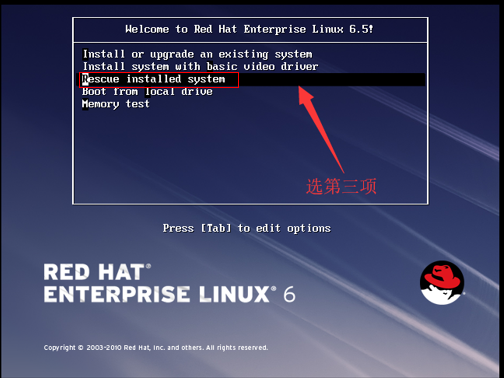 6、使用RHEL6.5系统光盘引导进入紧急修复模式